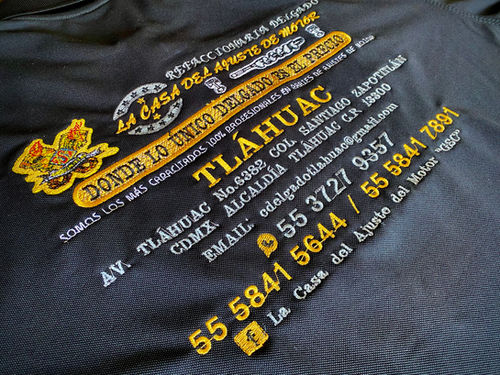 El tamaño del bordado en la espalda se limitará a un máximo de 20 cm. X 20 cm. En pedidos menores a 25 pzs se cobrará $150.00 ponchado.
